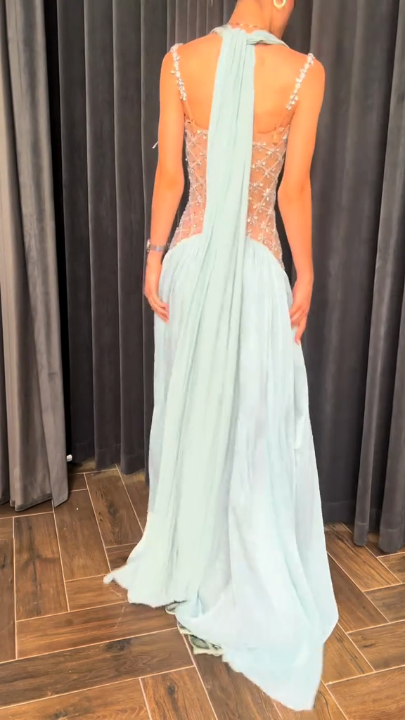 This light blue evening gown features a plunging V-neckline and fitted bodice, embellished with delicate beads and crystals for a captivating and sophisticated look. The flowing pleated skirt adds elegance, while the sheer, beaded midi skirt adds even more glamour.