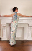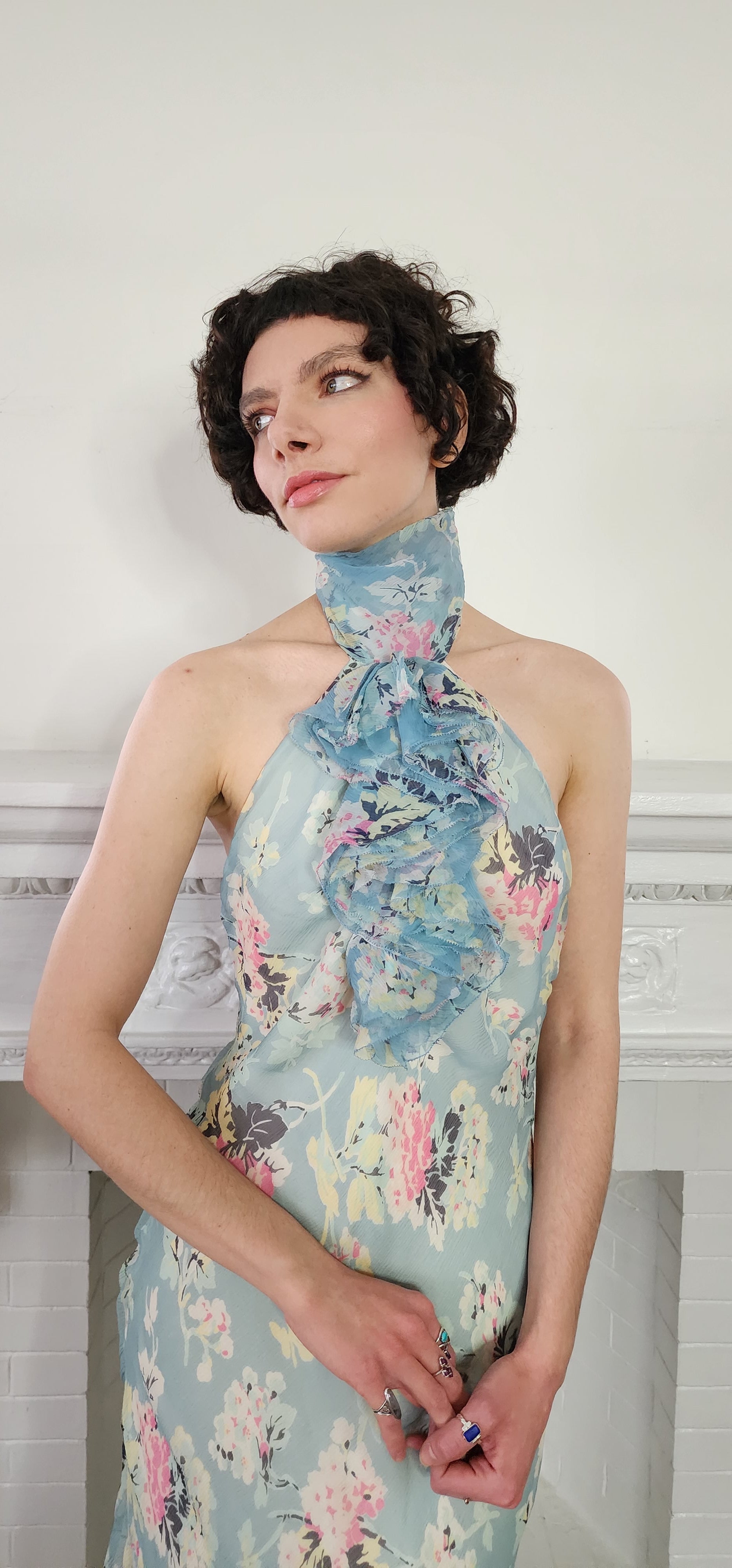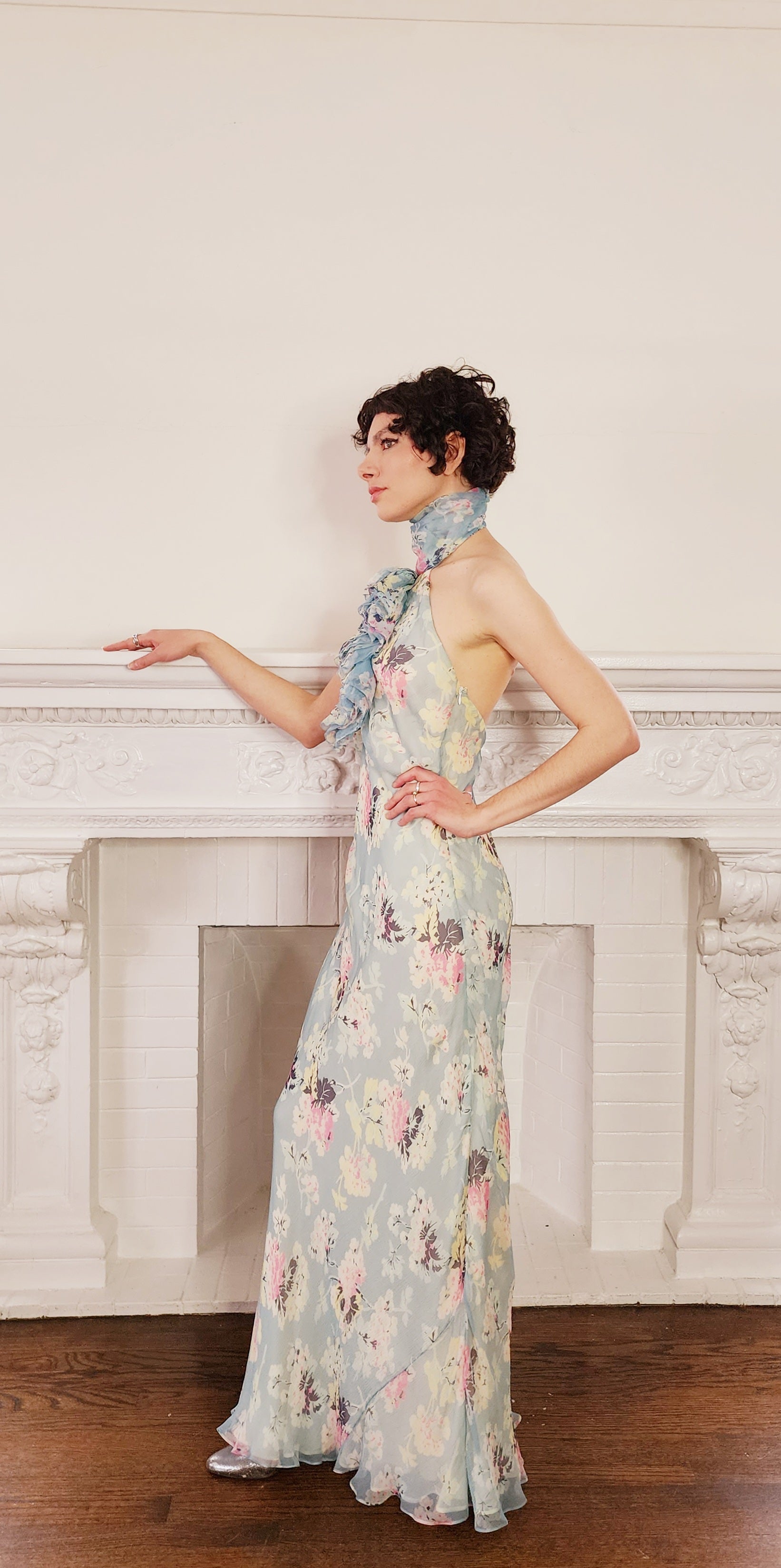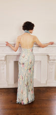 Light Blue Floral Ruffle Halter Maxi Dress
