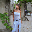 This light blue, backless maxi dress is crafted from delicate lace for a romantic and feminine look. The open back accentuates the shoulders and neck, while the high slit adds a touch of allure. The fitted top complements the flowing, loose skirt, creating a flattering silhouette that flatters all body shapes. The black belt cinches the waist and accentuates the figure, creating a striking contrast against the airy lace. This dress is perfect for summer parties, outdoor events, or beach weddings. Elevate the look with simple yet striking jewelry, like the model's necklace. Alternatively, pair it with simple sandals to highlight the dress's delicate lace and design.