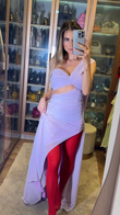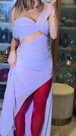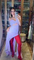 This lavender maxi dress features a stylish, exposed midriff for added appeal. The asymmetrical hem creates a dynamic, modern silhouette, while the draped fabric lends it an airy, elegant feel.