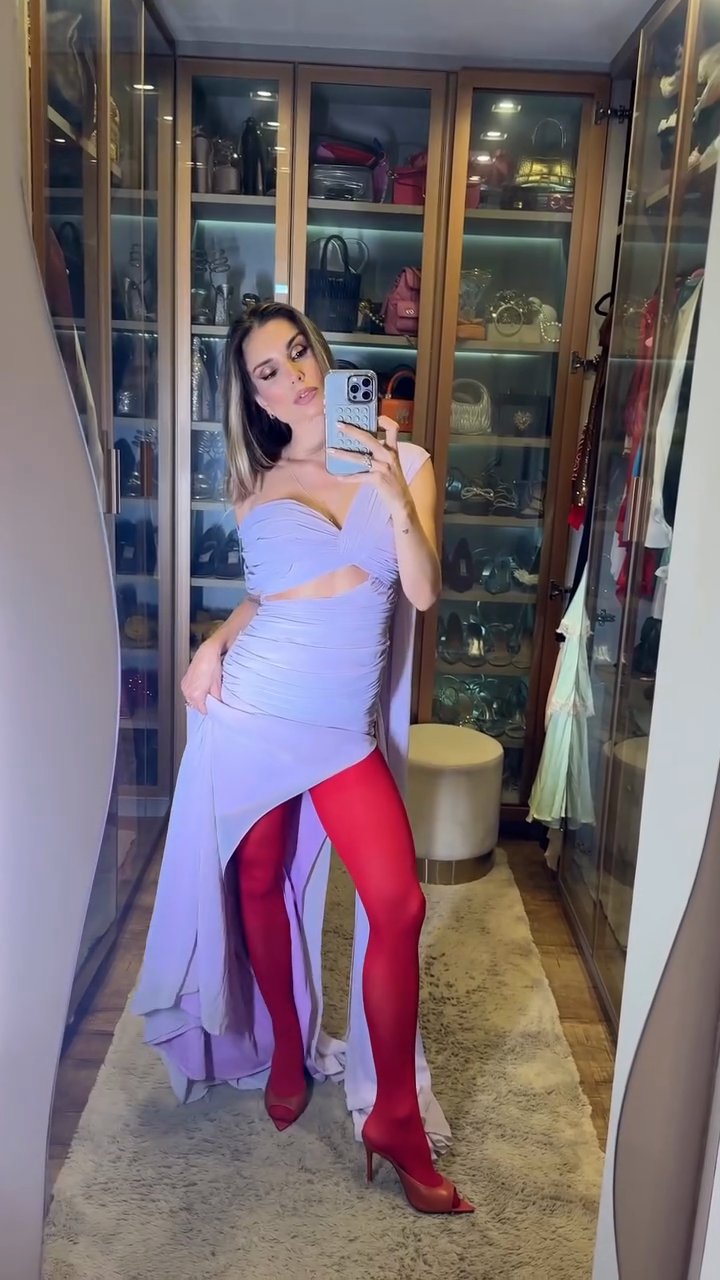 Pair this dress with bright red leggings and matching red heels for a stylish look. The soft lavender contrasts beautifully with the bold red, adding a playful, eye-catching touch.