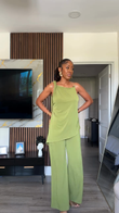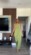 Lime Green Asymmetrical - Strap Top and Wide - Leg Pants Set