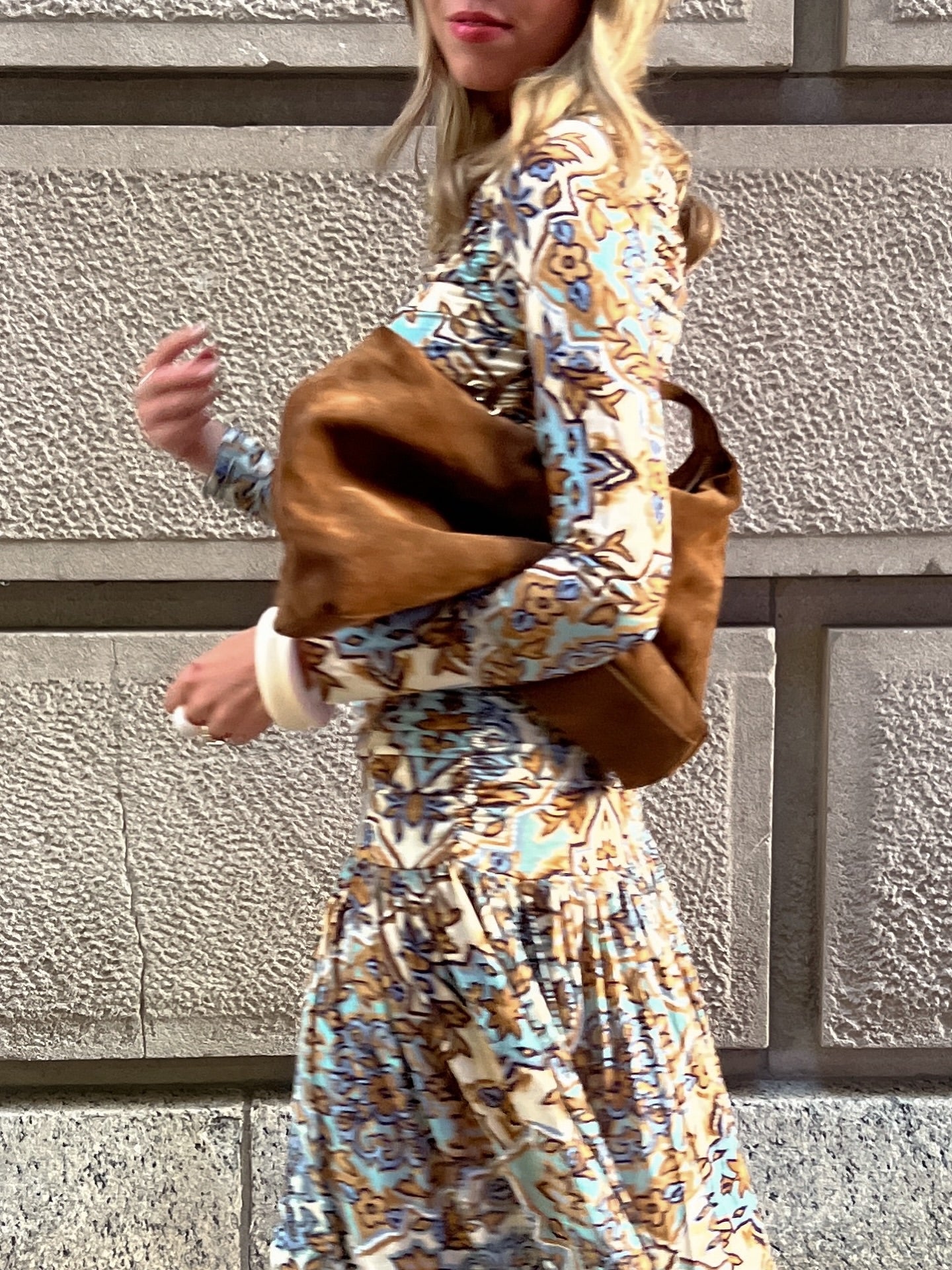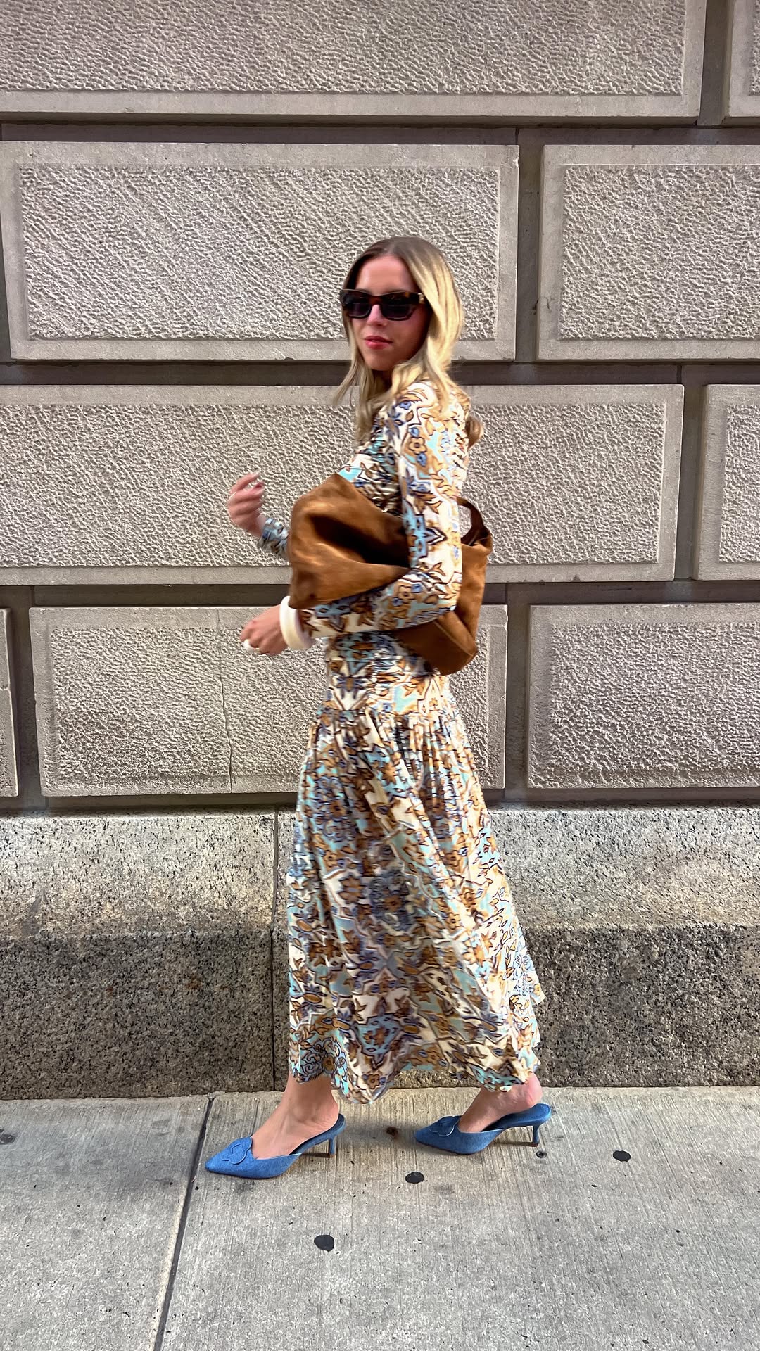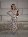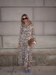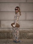 This maxi dress features long sleeves and a round neckline for a subtle yet stylish look. The delicate floral print blends blue, brown, and beige tones, adding a lively, artistic touch, making it the perfect finishing touch for any occasion.