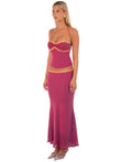 This two-piece set features a vibrant magenta halter top embellished with delicate beading and contrasting yellow piping. The matching maxi skirt features a high-waist design for a smooth, elongated silhouette. The exposed midriff adds a touch of allure.