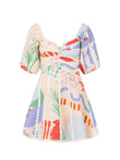 SunflowerHalo® presents this modern exquisite art graffiti floral print mini dress. which is stylish and comfortable. featuring a unique and fresh regional architecture and graffiti floral design to show your personality. The versatile neckline can be worn as a square neckline or a one-shoulder neckline to create a different occasion wear