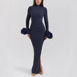 Elevate your evening look with this Navy Blue High - Neck Maxi Dress. The sleek silhouette, high neckline, and ruffled cuffs create a sophisticated, glamorous vibe. Perfect for formal events or special occasions. Lightweight fabric ensures fast page load. Shop now for a timeless, chic outfit!