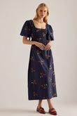 Navy Strawberry - Embroidered Puff Sleeve Midi Dress