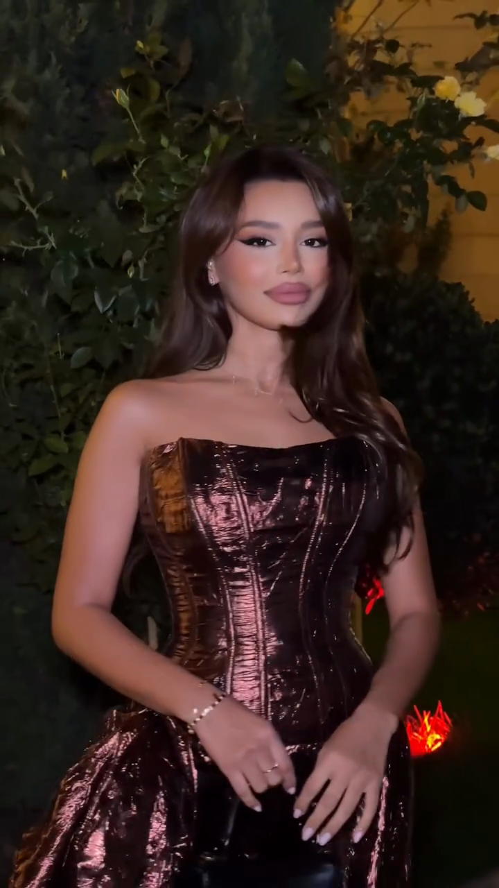 This bronze off-the-shoulder gown features a cinched waist, cinching the waist and creating an hourglass silhouette. The metallic fabric shimmers brilliantly under the light, adding a luxurious touch, making it the perfect choice for formal occasions.