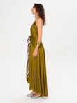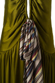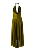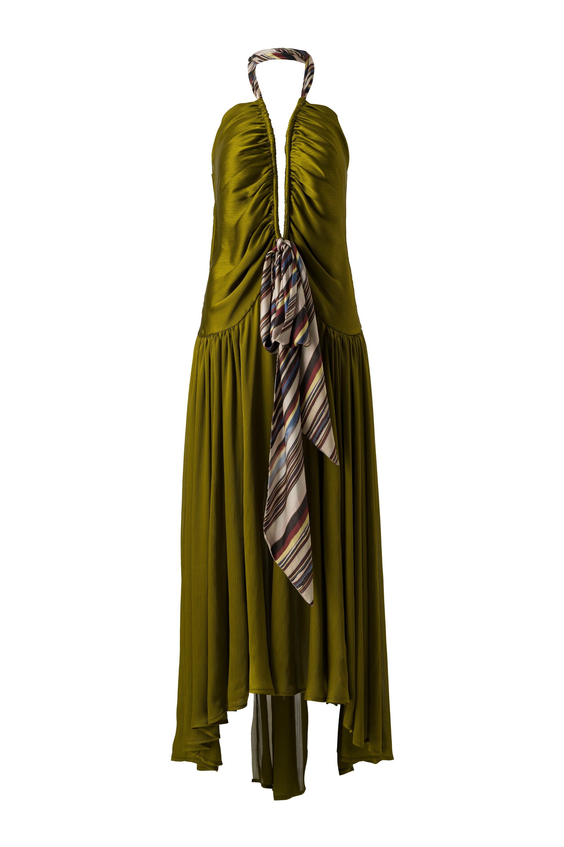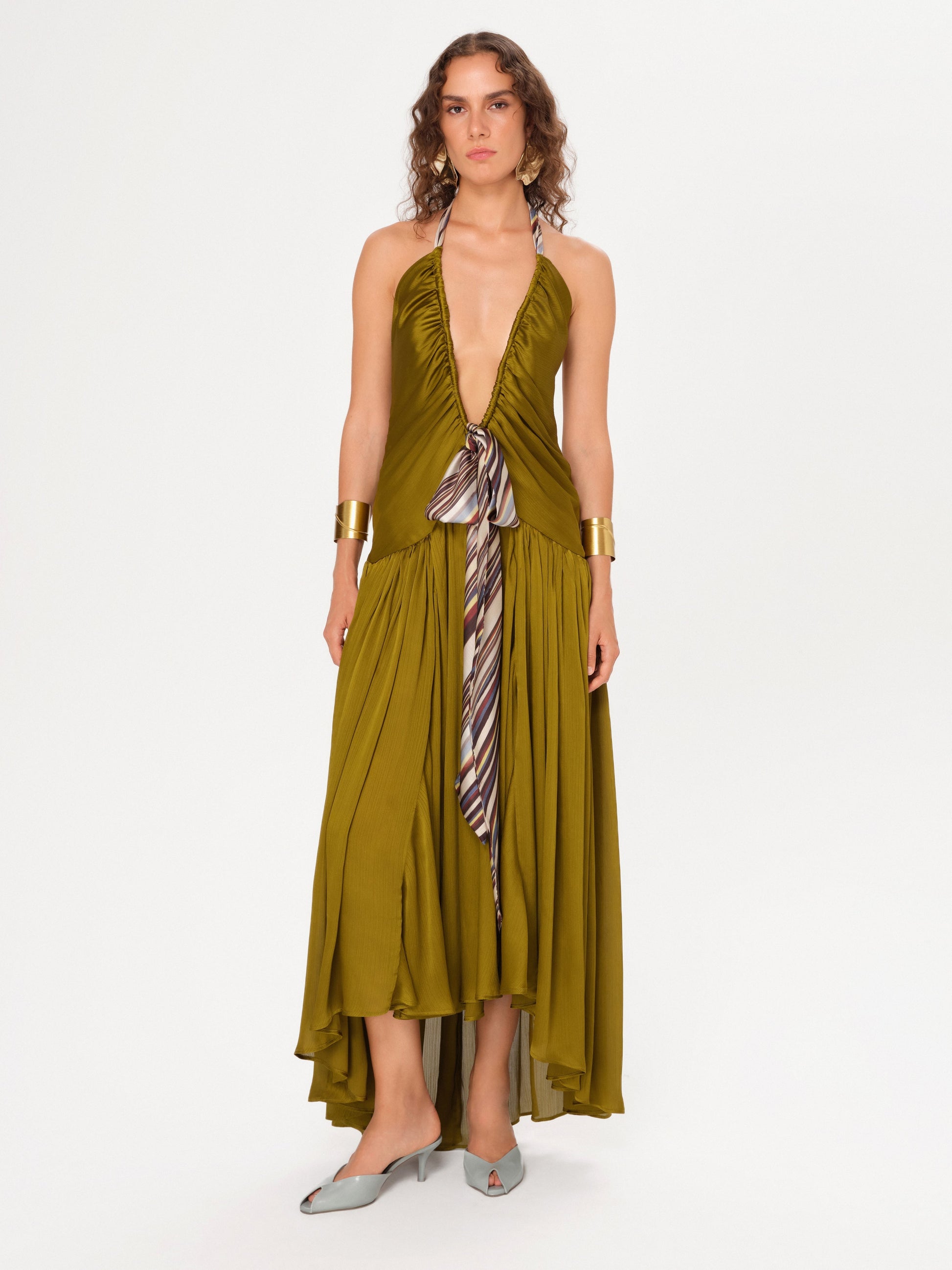 Olive Green Halterneck Maxi Dress is featured a deep V - neckline, a tiered skirt, and a decorative striped scarf tied at the waist. Gold - toned cuff bracelets and light - colored, open - toe heels complete the look. This outfit is suitable for formal or semi - formal events, such as garden parties, evening gatherings, or summer weddings, exuding elegance and a touch of bohemian style.