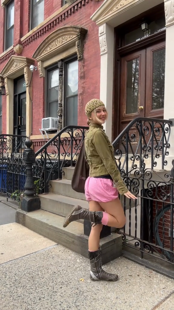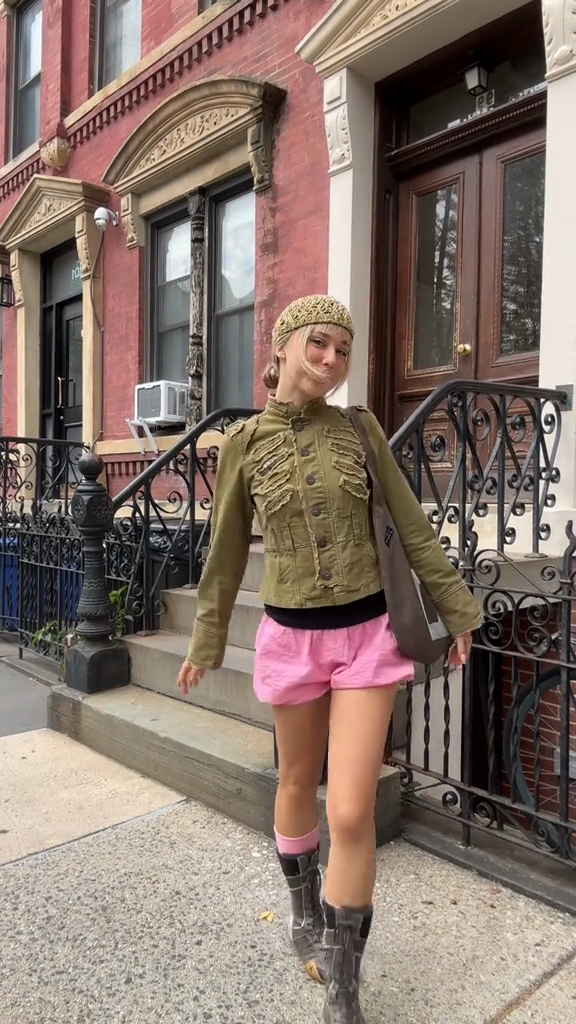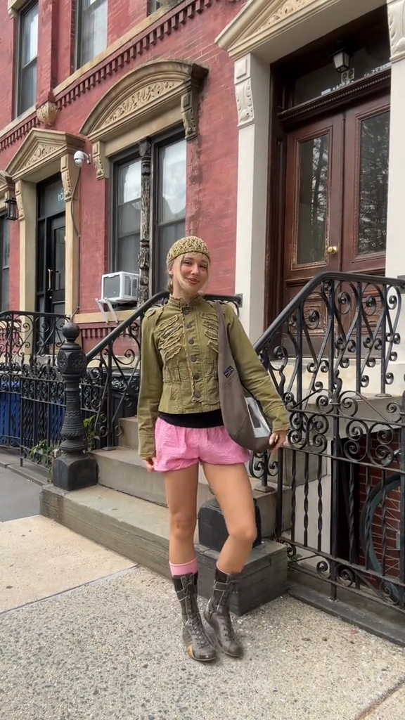 It's perfect for a bold, fashionable look. As shown, it's paired with bright pink shorts, creating a striking contrast between the rugged jacket and the playful shorts. For an edgier look like the model, pair it with knee-high boots. It's perfect for casual outings, street style, or adding a touch of whimsy to your everyday wardrobe.