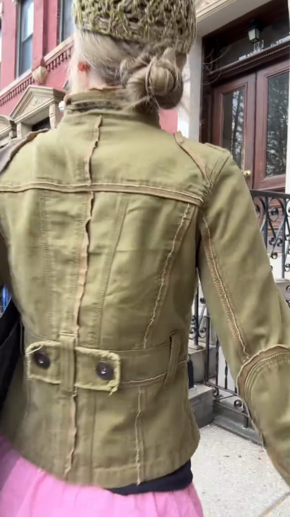 This olive green jacket, inspired by military style, features a high collar and epaulettes. Distressed details on the front add a rugged, vintage feel, making it a standout piece.