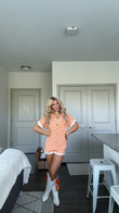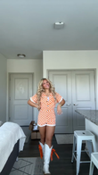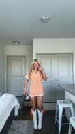 This orange and white checked bodysuit features a short-sleeved cardigan design with button detailing and white piping at the cuffs. A pair of white cowboy boots adorned with orange bows complement the bodysuit's color scheme and add a playful touch. The bodysuit is made of cotton, making it soft and comfortable for everyday wear. The cowboy boots are made of leather for a sturdy feel. This outfit is perfect for casual outings like weekend shopping, music festivals, or county fairs. Accessorize with a simple gold necklace or earrings to enhance the look.