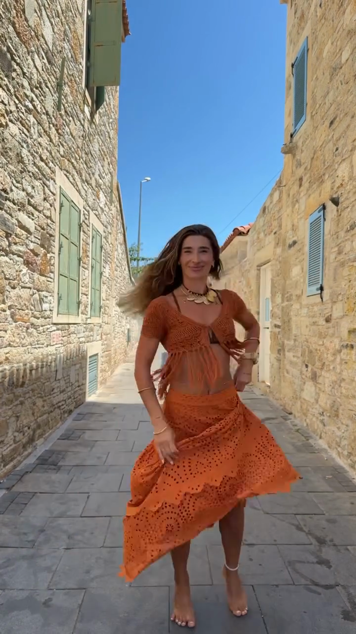 Orange Crochet Fringe Top & Eyelet Skirt Set