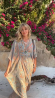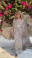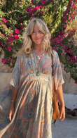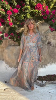 This maxi dress, embellished with a delicate paisley pattern in soft, muted hues, exudes a relaxed, bohemian vibe. The V-neck and nipped waist flatter the figure, while the flowing skirt adds a touch of elegance.