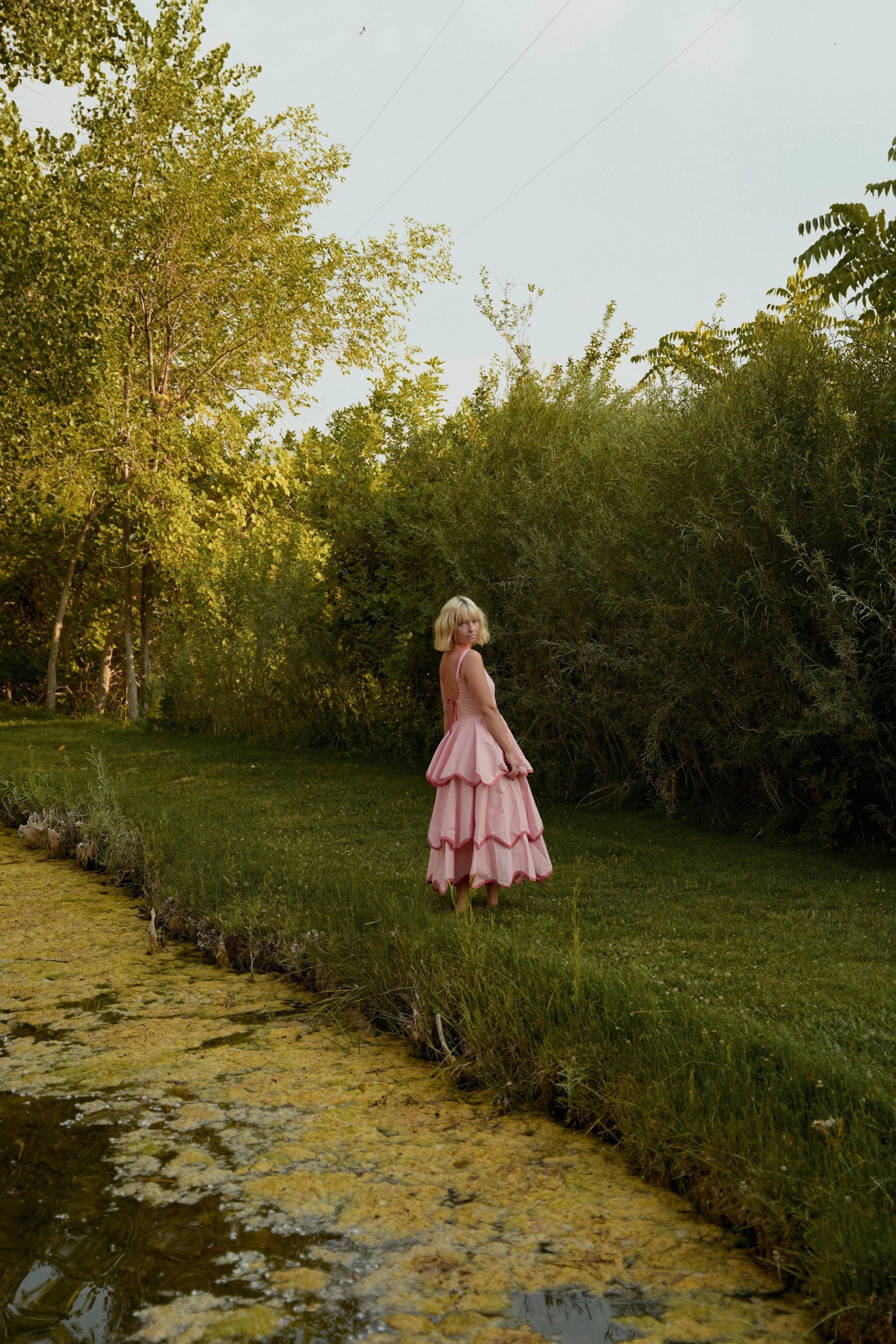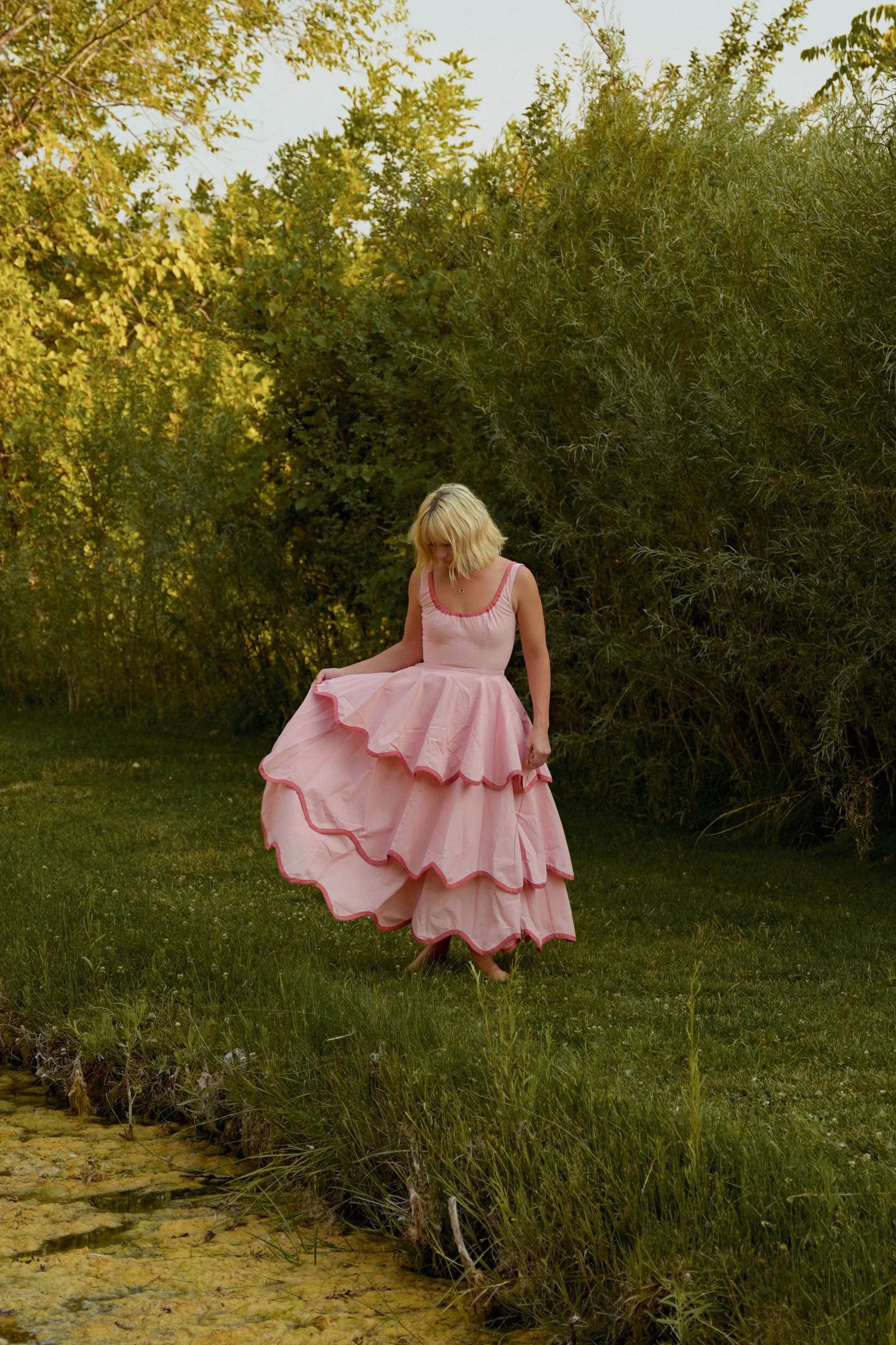 This pink midi dress features a tiered skirt with scalloped edges for a playful, feminine look. The sleeveless bodice and square neckline create a timeless, elegant silhouette, perfect for warm weather.
