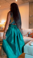 Elevate your style with this chic set. The printed sleeveless top features vibrant patterns, paired with an emerald green pleated midi skirt for a sophisticated, artistic look. Perfect for special occasions or cultural - inspired outfits. Lightweight design ensures fast page load. Shop now for a standout, elegant ensemble!