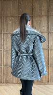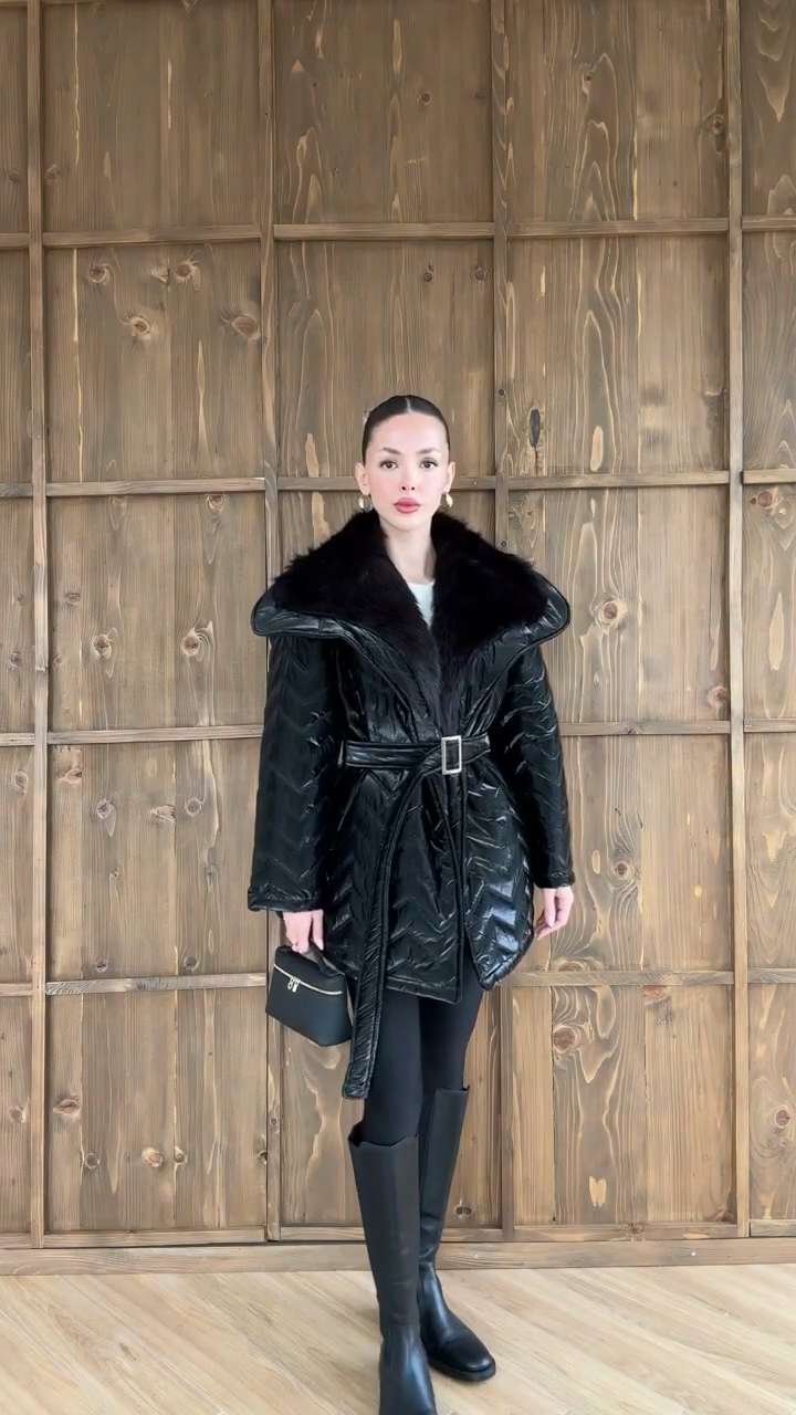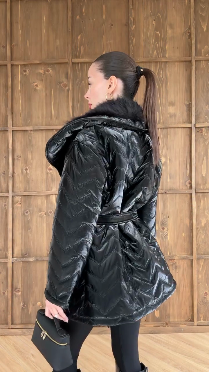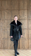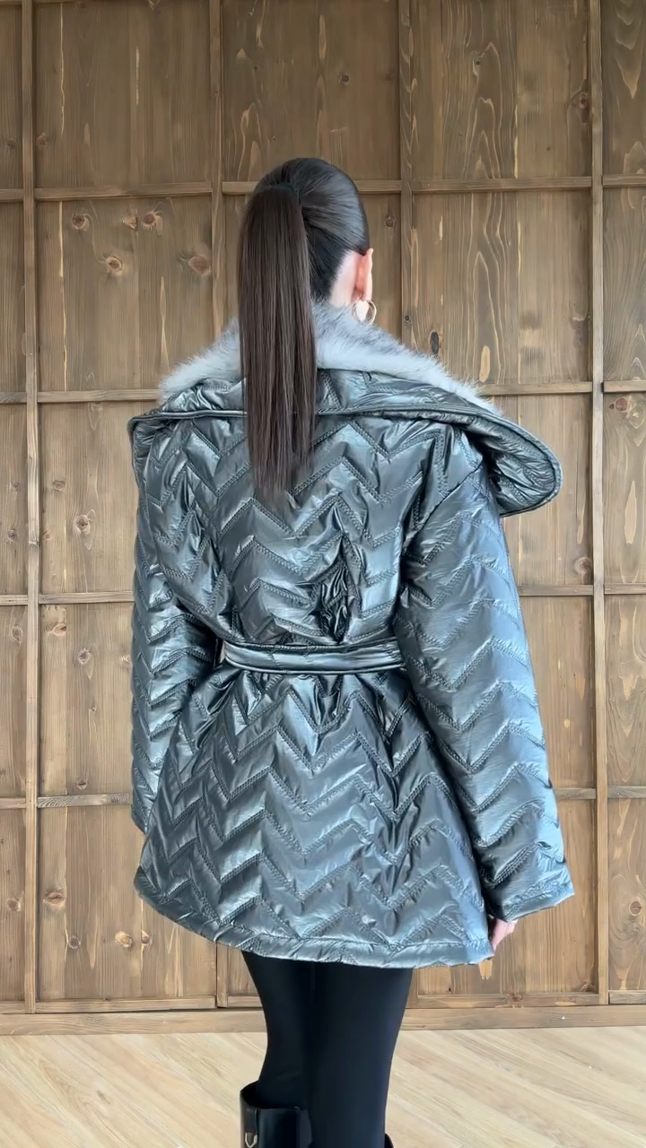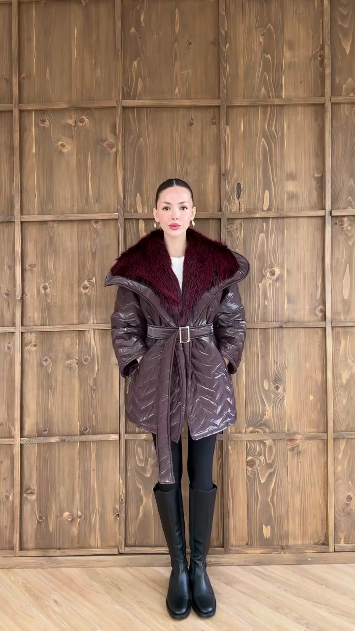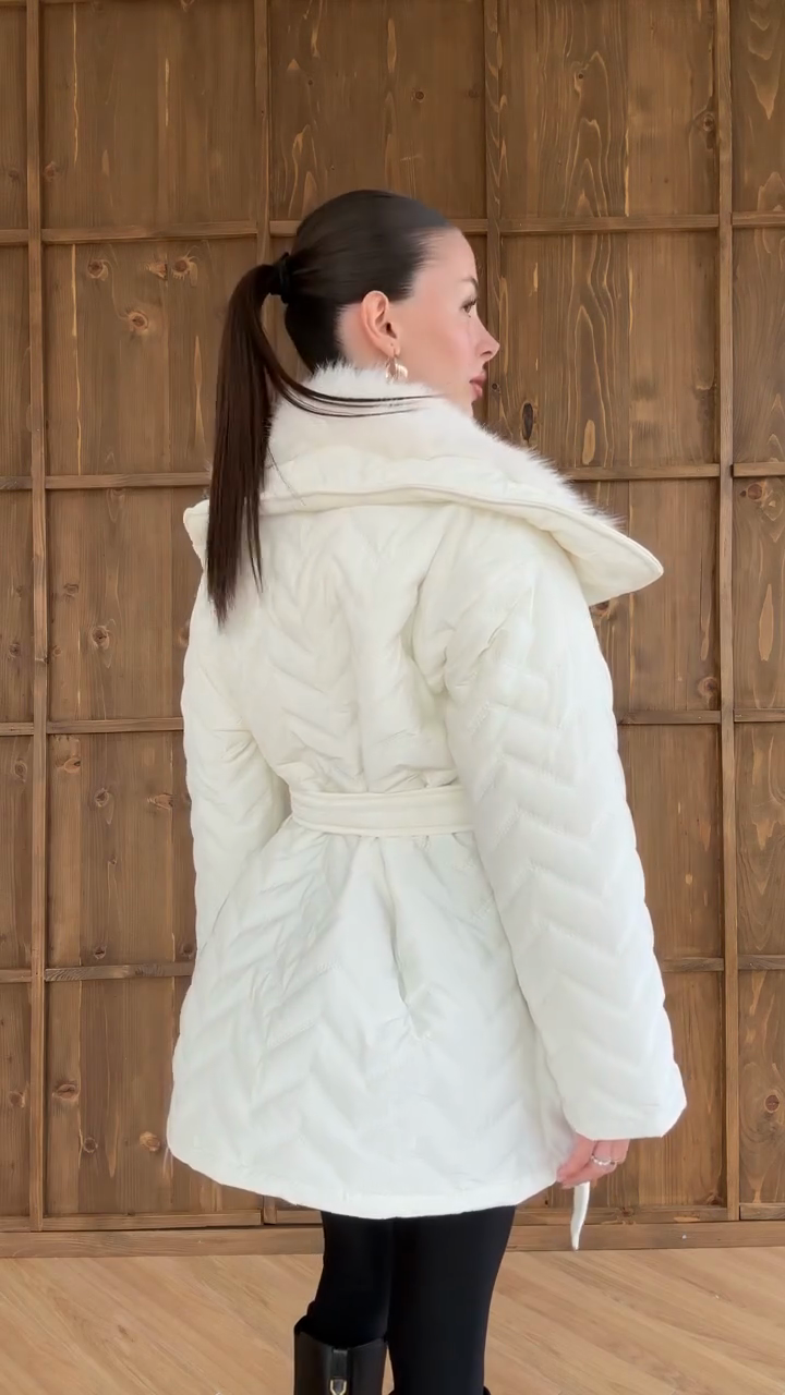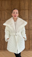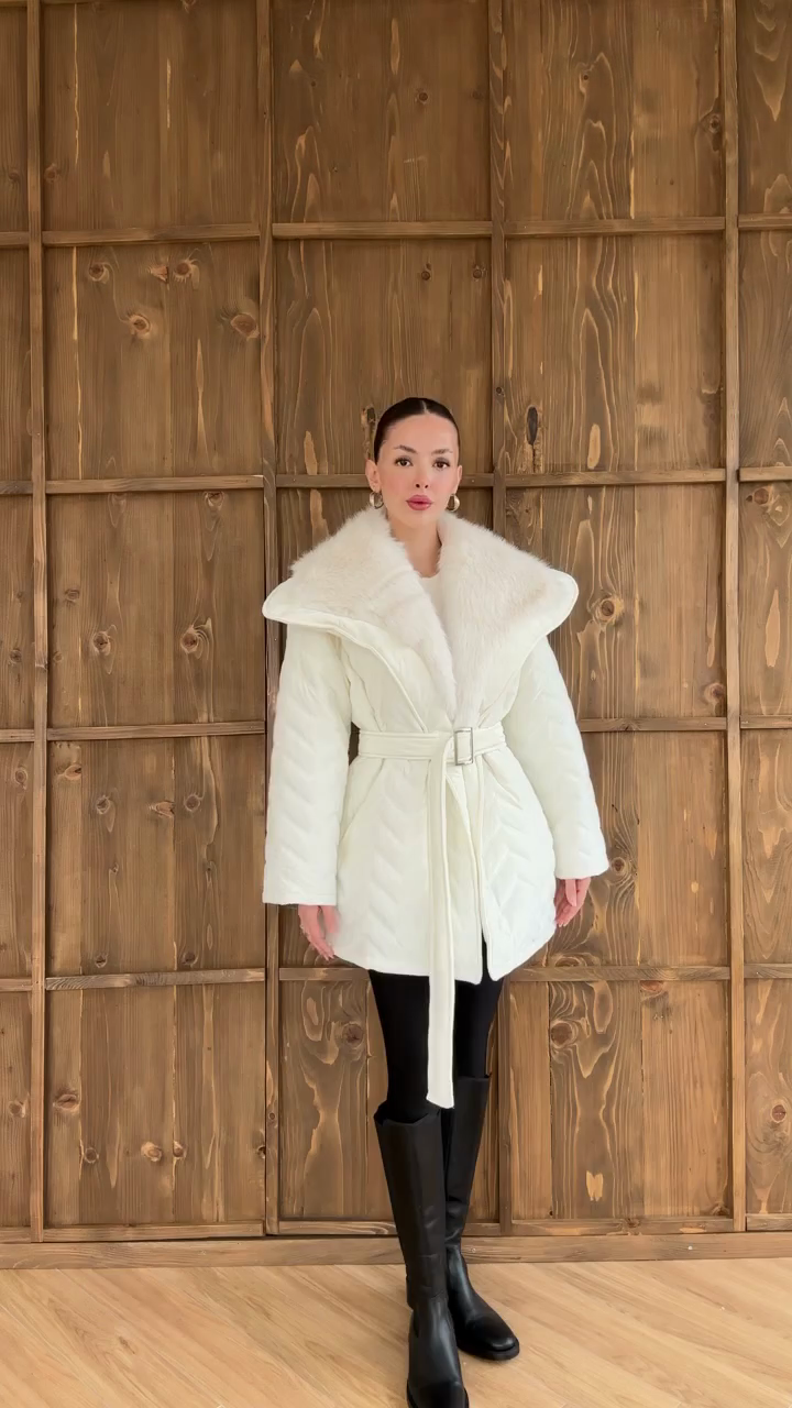 This quilted coat features a luxurious faux fur collar, adding a touch of luxury and warmth. The quilted pattern lends it a textured, modern feel, while the wide lapels and belt create a flattering silhouette.