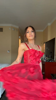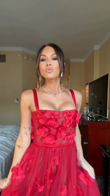 This stunning red gown features slender straps and a square neckline. The bodice and skirt are embellished with delicate 3D floral patterns, creating a romantic and luxurious ambiance. The flowing skirt further enhances the gown's elegant silhouette. Paired with a delicate necklace, this gown is perfect for formal occasions like gala dinners and weddings. Its vibrant color and sophisticated design are sure to make a statement.