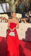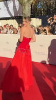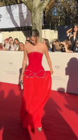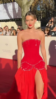 Red off-the-shoulder embellished gown