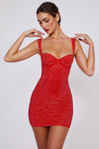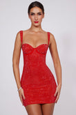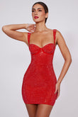 This red mini dress features a sweetheart neckline and slender straps, embellished with sparkling crystals for a captivating look. The slim fit flatters the figure, making it the perfect finishing touch for any special occasion.
