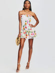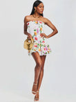 This sexy mini dress features a ruched stretch bustier design with internal tie closure and a layered ruffled hem adorned with lace trim. Pair it with your favorite woven accessories for a sweet and casual look.