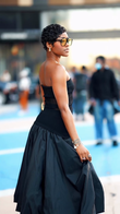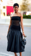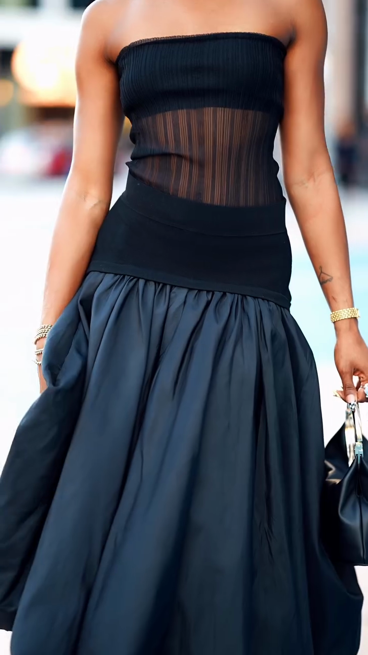 This stylish black ensemble features an off-the-shoulder top paired with a sheer midi skirt for added glamour. Pairing the flowing, elegant black midi skirt with black platform heels featuring lace-up details and a black handbag with metal handles completes the look. This outfit is both sophisticated and edgy, perfect for any social occasion.