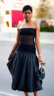 Sheer black off-the-shoulder top and midi skirt set