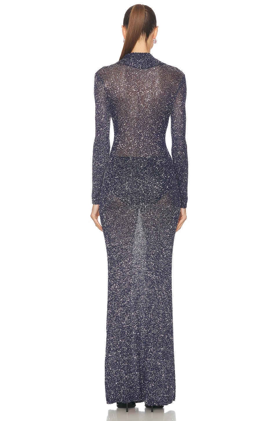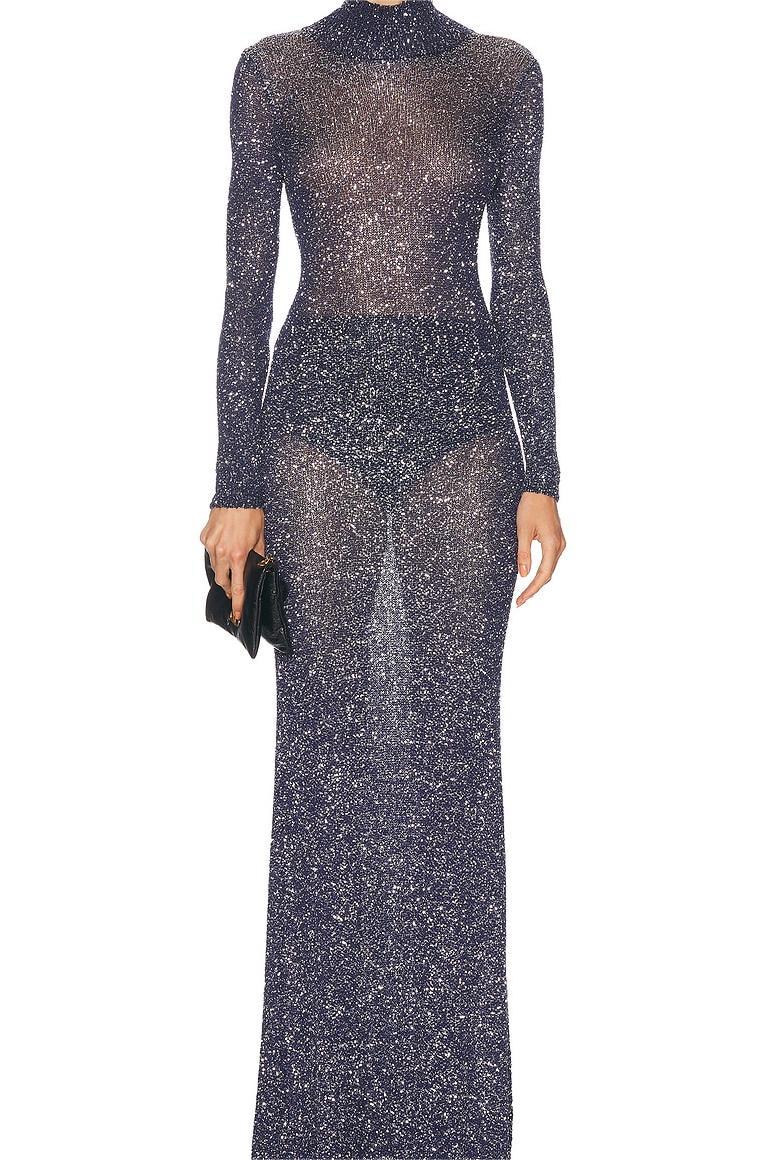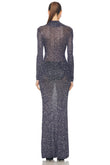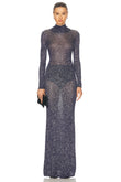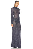 This maxi dress is crafted from a lightweight fabric and embellished with sequins for a dazzling effect. The long sleeves and high neckline add an elegant touch, while the fitted silhouette flatters the figure.