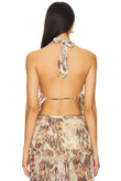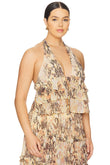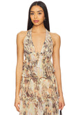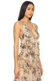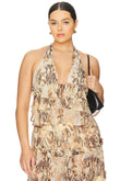 This backless dress features a plunging V-neck and a striking beige, brown, and black snake print. The cascading ruffles add a playful, feminine touch, enhancing the overall visual appeal. The drawstring at the front allows for adjustable length, making it both stylish and practical.