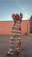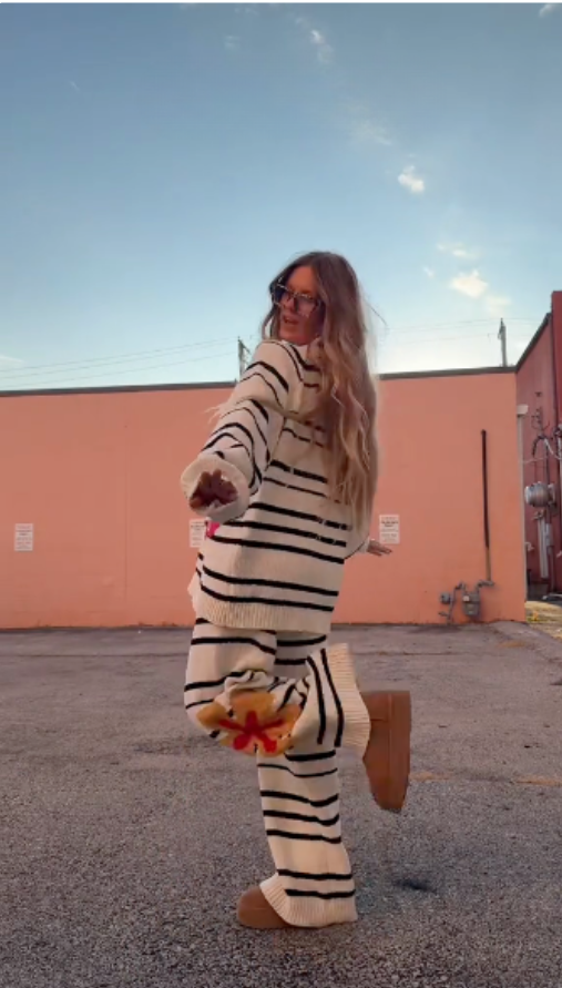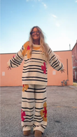 The person is wearing a matching knit co - ord set. The set consists of a beige and black striped sweater with large, colorful floral patterns in pink and yellow, and matching striped pants with the same floral design. They're paired with brown, platform - style shoes. This outfit has a casual, cozy, and stylish vibe, suitable for relaxed outings or loungewear - inspired looks.