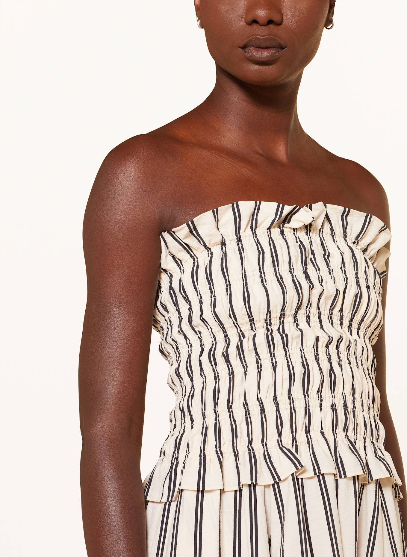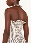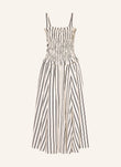 Striped Smocked- Piece Dress featuring a smocked, striped top with thin straps and a matching high - waisted, wide - leg midi skirt. The outfit has a nautical - inspired black - and - white striped pattern. Accessories include a beige woven tote bag with brown leather trim and a polo - horse logo, as well as beige lace - up shoes. This ensemble is perfect for casual summer outings, beach trips, or daytime events, offering a relaxed yet stylish look.