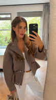 This taupe cropped work jacket features a high stand-up collar and front zip for a stylish, edgy look. The jacket features multiple pockets, combining practical functionality with a stylish, utilitarian look. The drawstring waistband allows for an adjustable fit, enhancing the slim silhouette. As shown, it pairs effortlessly with a simple white top and pants for a clean, modern look. It's perfect for transitioning between seasons and casual occasions like cafés, shopping, or weekend strolls. You can also style it with a dress or jeans for a different look. Made from durable fabric, it's comfortable and warm without sacrificing style. Accessorize with a delicate necklace and a stylish handbag to complete the look.