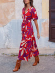 V-Neck Puff Sleeves Slit Printed Maxi Dress
