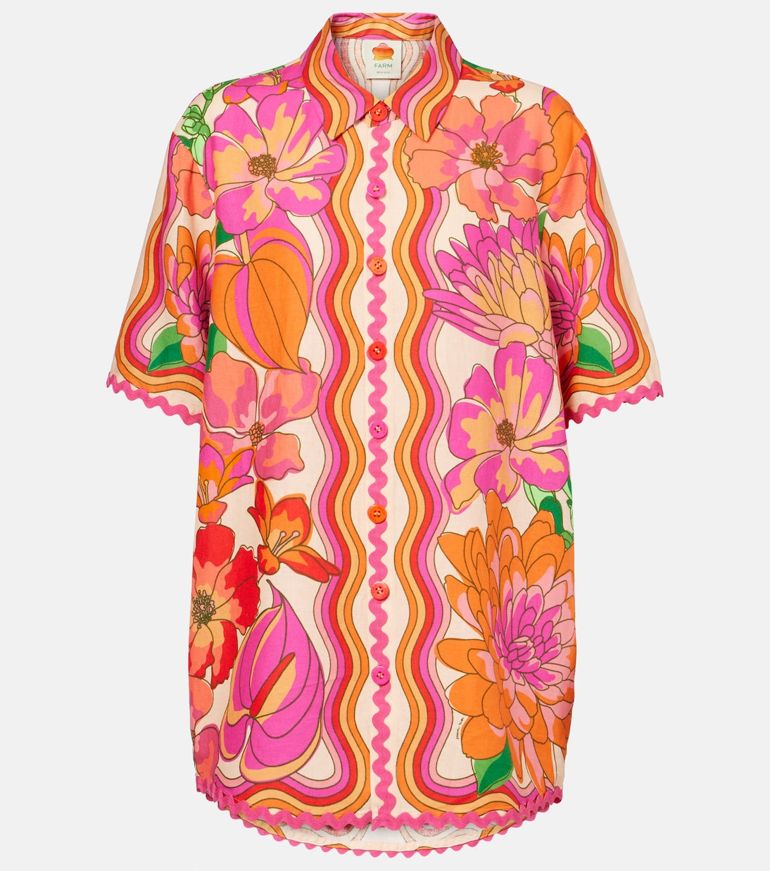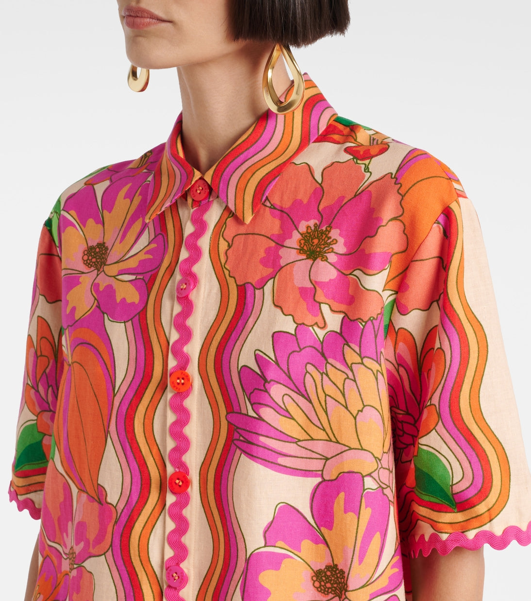 BVibrant Floral Print Shirt and Shorts Set with a short - sleeved button - up shirt and shorts, both featuring a vibrant floral print with bold colors like pink, orange, and green on a light background. The edges of the shirt and shorts have a scalloped trim. Accessories include large hoop earrings, a woven handbag, and brown strappy sandals. This outfit exudes a fun, summery, and stylish vibe, suitable for casual outings, beach trips, or summer festivals.