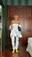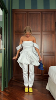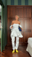This outfit features a white off-the-shoulder top with exaggerated puff sleeves, creating a voluminous, striking silhouette. Paired with white trousers, it adds a touch of simple sophistication. Bright yellow clogs add a pop of color and playfulness, while a blue handbag creates a striking contrast to the predominantly white look.