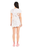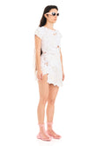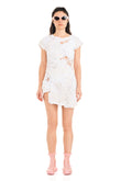 Short sleeve mini dress made with upcycled t-shirt and mesh scraps. All over texture and hand knitted openings throughout. This dress is constructed with reclaimed single use t-shirts which are collected before being sent overseas to landfill.