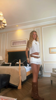 This outfit features a white sleeveless cropped top with delicate ruffled and lace - like details, paired with matching white ruffled shorts. A brown belt cinches the waist, adding contrast. Complemented by brown cowboy boots, gold jewelry including necklaces and bracelets, the look creates a blend of casual and bohemian styles, suitable for a summer day out, a music festival, or a casual social event.