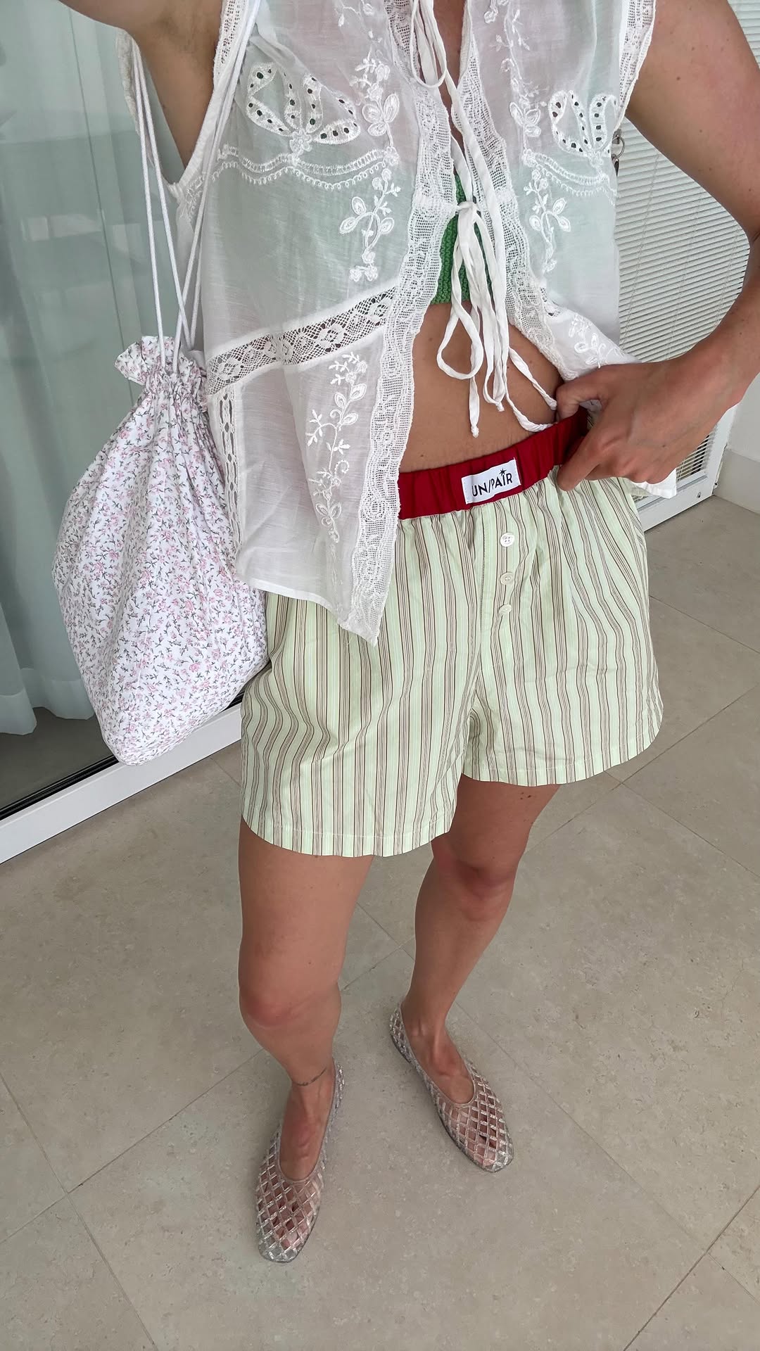 White Embroidered Lace - Up Tank Top & Striped Shorts Set