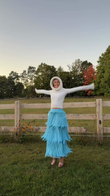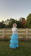This outfit, featuring a cozy white hooded sweater and a light blue layered skirt, creates a warm and casual vibe. The skirt's textured, layered design adds a touch of whimsy and creates a playful contrast with the stylish sweater.