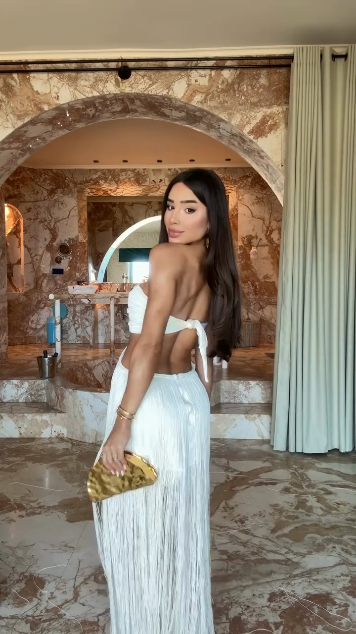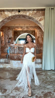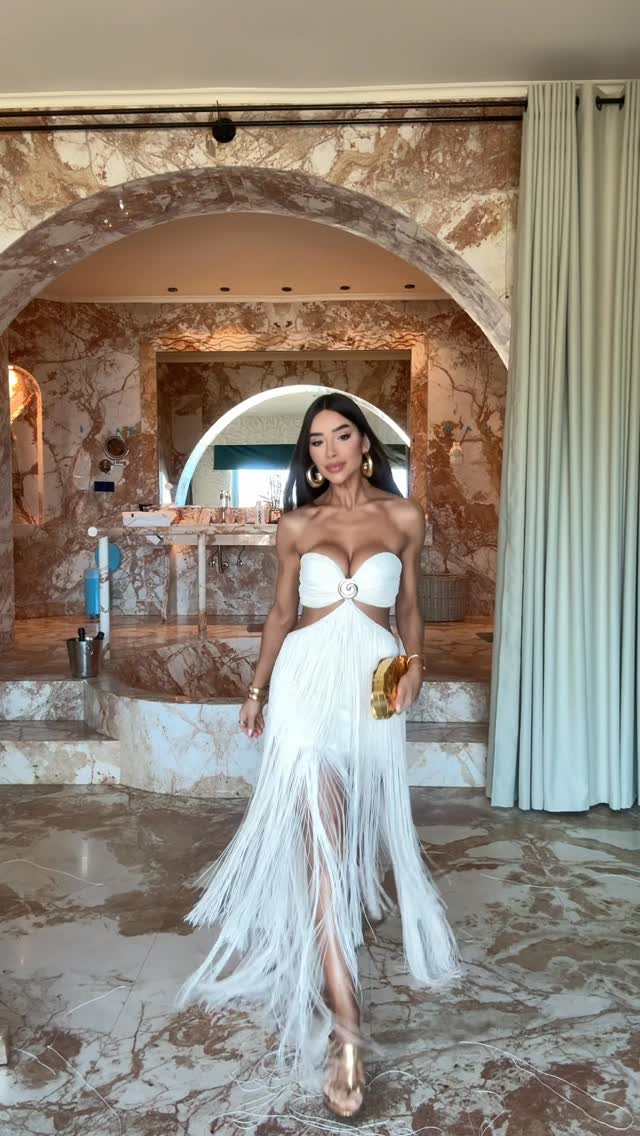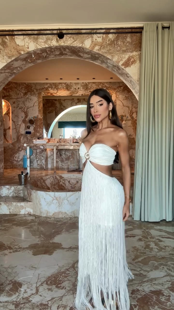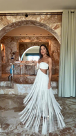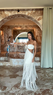 This white maxi dress features an off-the-shoulder design, accented by a unique knot detail at the bust for an elegant touch. A cutout waist accentuates the figure, while the long fringe detail at the hem creates a striking visual effect, giving the dress a dynamic feel.