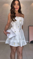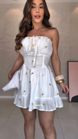 White Pineapple - Print Strapless Mini Dress features a corset - style bodice with a drawstring detail at the front and a flared, ruffled skirt. Accessories include large hoop earrings, a chunky gold bracelet, and a white clutch bag. This outfit has a fun, summery vibe, perfect for casual outdoor events, beach parties, or a day out in warm weather.