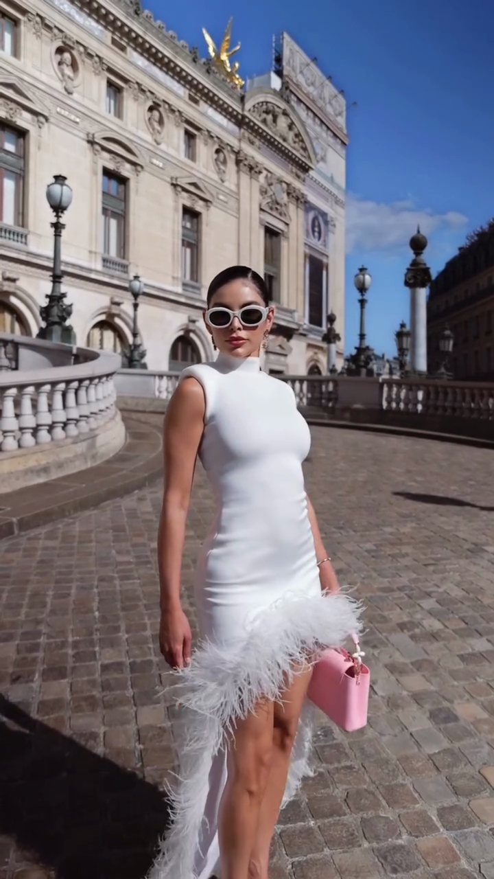 White Sleeveless Turtleneck Feather Train Mini Dress