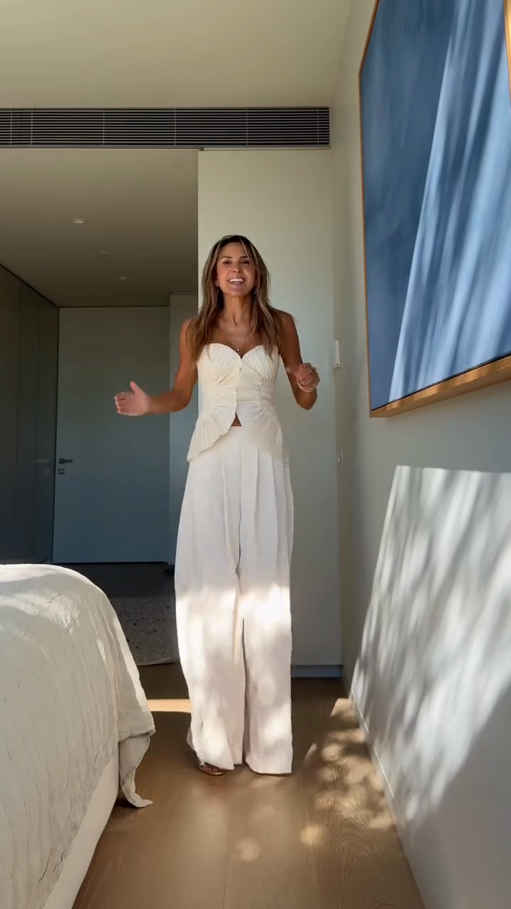 This outfit features a white strapless ruched top that cinches at the waist, creating a flattering silhouette with a small cut - out detail. Paired with wide - leg white pants, the ensemble gives a clean, elegant, and sophisticated look. It's suitable for semi - formal events, summer parties, or upscale casual outings, exuding a minimalist yet stylish vibe.