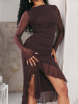 Introducing our "Wine Ruffle Midi Dress" – The epitome of elegance and sophistication!