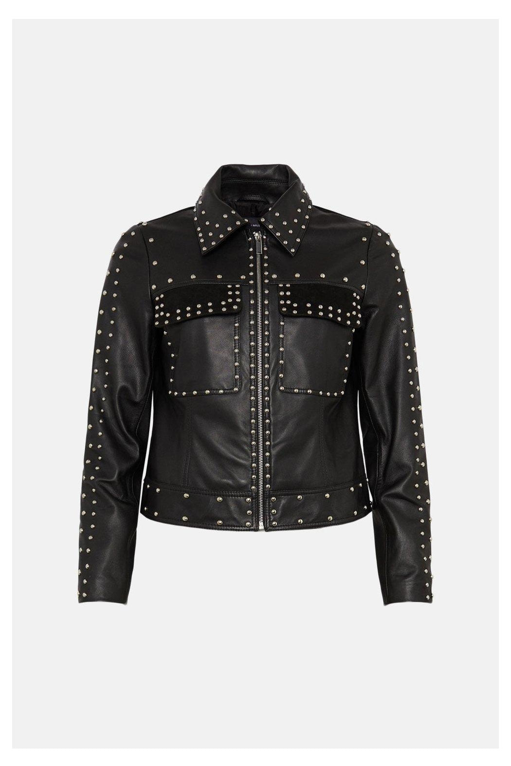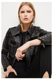 This black leather jacket features extensive silver stud embellishments across the collar, shoulders, sleeves, and front pockets, giving it a bold, edgy look. It has a classic collar and a zipper - up front. Paired with a black top and black pants, along with statement earrings, the outfit is sleek and suitable for creating a striking, fashion - forward appearance, ideal for nights out or events where a stylish, punk - inspired look is desired.