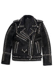 The outfit features a black suede moto jacket adorned with numerous silver studs, adding an edgy and punk - rock flair. It's paired with a simple white T - shirt, light - wash blue jeans, and a black leather bag with a silver chain strap and hardware. The person also wears statement - making earrings, contributing to the overall stylish and rebellious look, suitable for urban settings or casual outings where a fashion - forward statement is desired.
