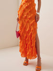 Crafted with meticulous attention to detail, this dress features a unique wood ear skirt design that adds an intriguing touch to the classic maxi silhouette. The subtle side slit adds a hint of allure and movement as you walk, exuding confidence and elegance.